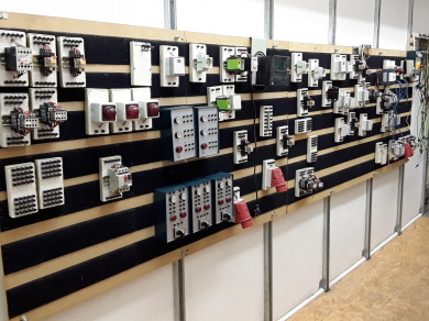 In unserer Werkstatt werden die Auszubildenden in den Grundlagen der Metallbearbeitung, der Meßtechnik, der Steuerungs- und Regelungstechnik, im Schaltschrankbau sowie in der Erstellung von Schaltplänen ausgebildet. Die im Bild zu sehende Ausbildungswand ist ein wichtiger Bestandteil der Ausbildung, hier kann jeder Auszubildende Schaltungen aufbauen und unter Anleitung des Meisters diese unter realen Bedingungen ausprobieren. Jede Theorie kann so mit praktischen Beispielen untermauert werden, der Lerneffekt wird dadurch verdoppelt.